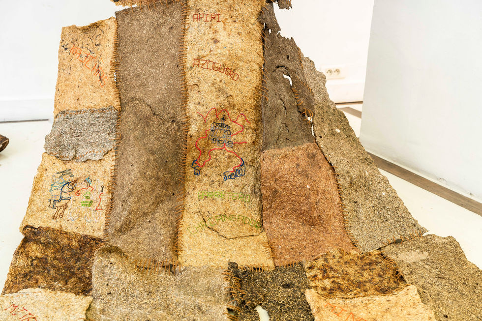 Acier, terre, paille, ouate de cellulose, broderies (...)
